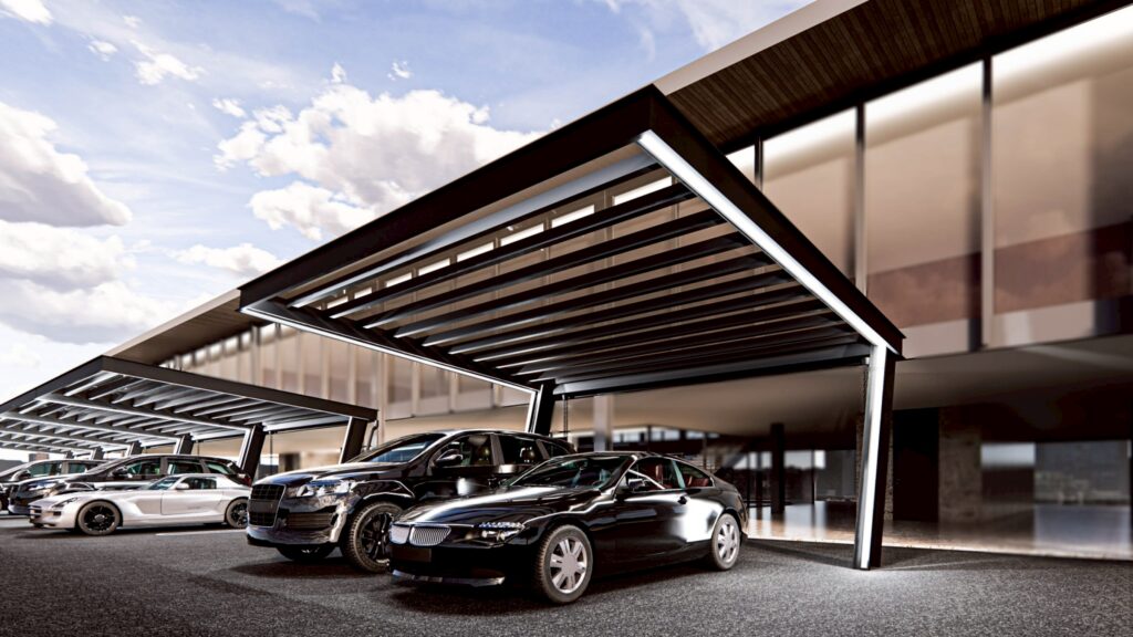 โรงจอดรถสไตล์โมเดิร์น ดีไซน์สวย เรียบหรู ดูเท่ห์ โครงสร้างเหล็กที่มีแข็งแรงคงทน มีระบบรางน้ำในตัว