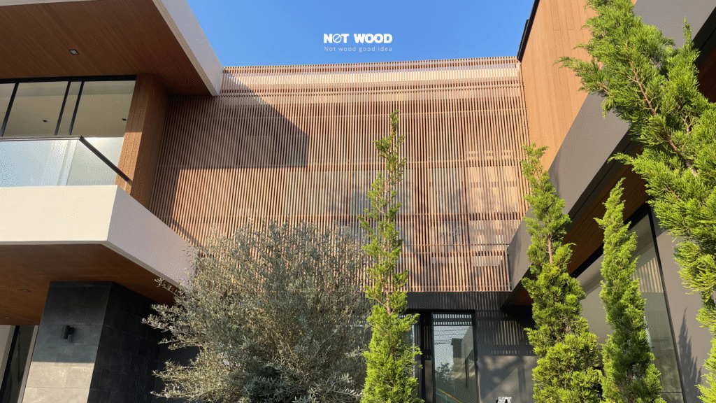 ลูกค้าเลือกใช้ฝ้าไม้เทียม Not wood สี Tiger wood ซึ่งเป็นฝ้าไม้เทียมโทนสีสัก มาตกแต่งฝ้าและผนังบริเวณศาลาในสวนข้างบ้าน เข้ากับสวนข้างบ้าน ที่ได้จัดวางมาอย่างสวยงาม ลงตัว